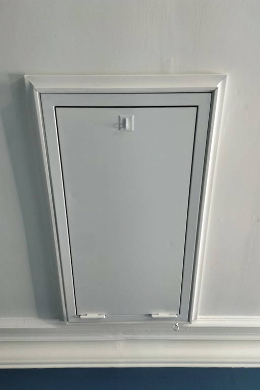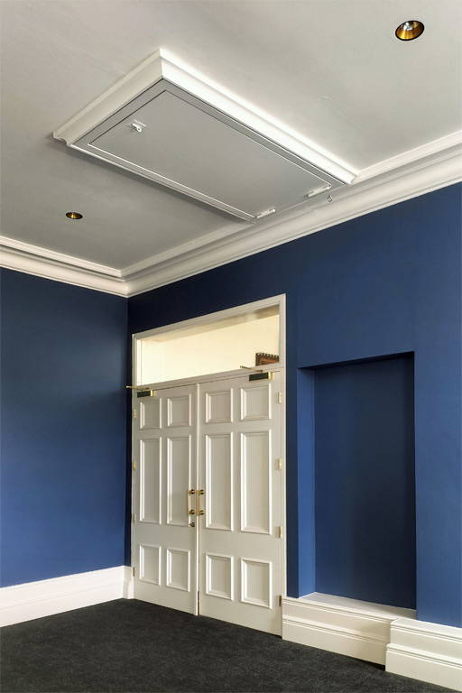 The fire-rated hatch was installed with decorative architrave and painted white to match the décor of the hall.