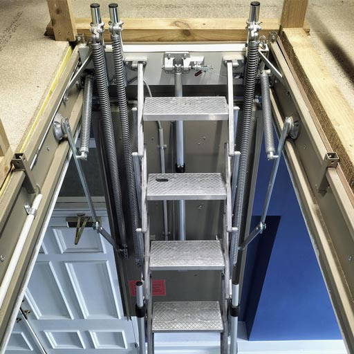 Automatic fire-rated loft ladder with telescopic handrail on both sides.