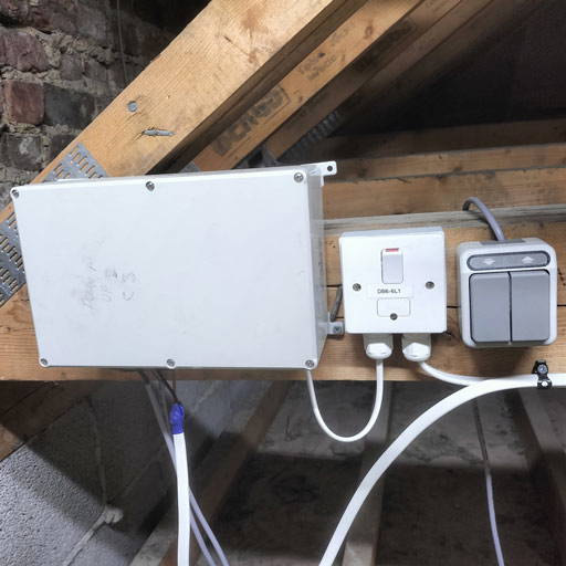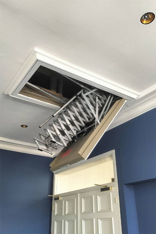 Rosslee Construction installed the fire-rated electric loft ladder to a particularly high-standard (as can be seen here). Architrave was fitted around the hatch box to provide a decorative finish that complements the period features of the Hall. Also, the underside of the hatch was painted white to match the ceiling.